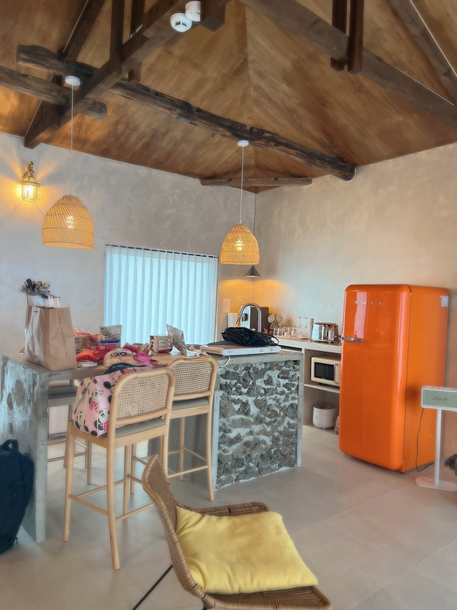 숙소 안의 라탄가구와 은은한 주황 조명의 조합이