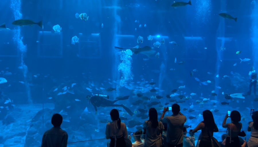 가장 큰 수족관으로 넘어가니 다이버들이 물속에서 물고기들에게 먹이를 주는 공연? 같은 걸 했다.